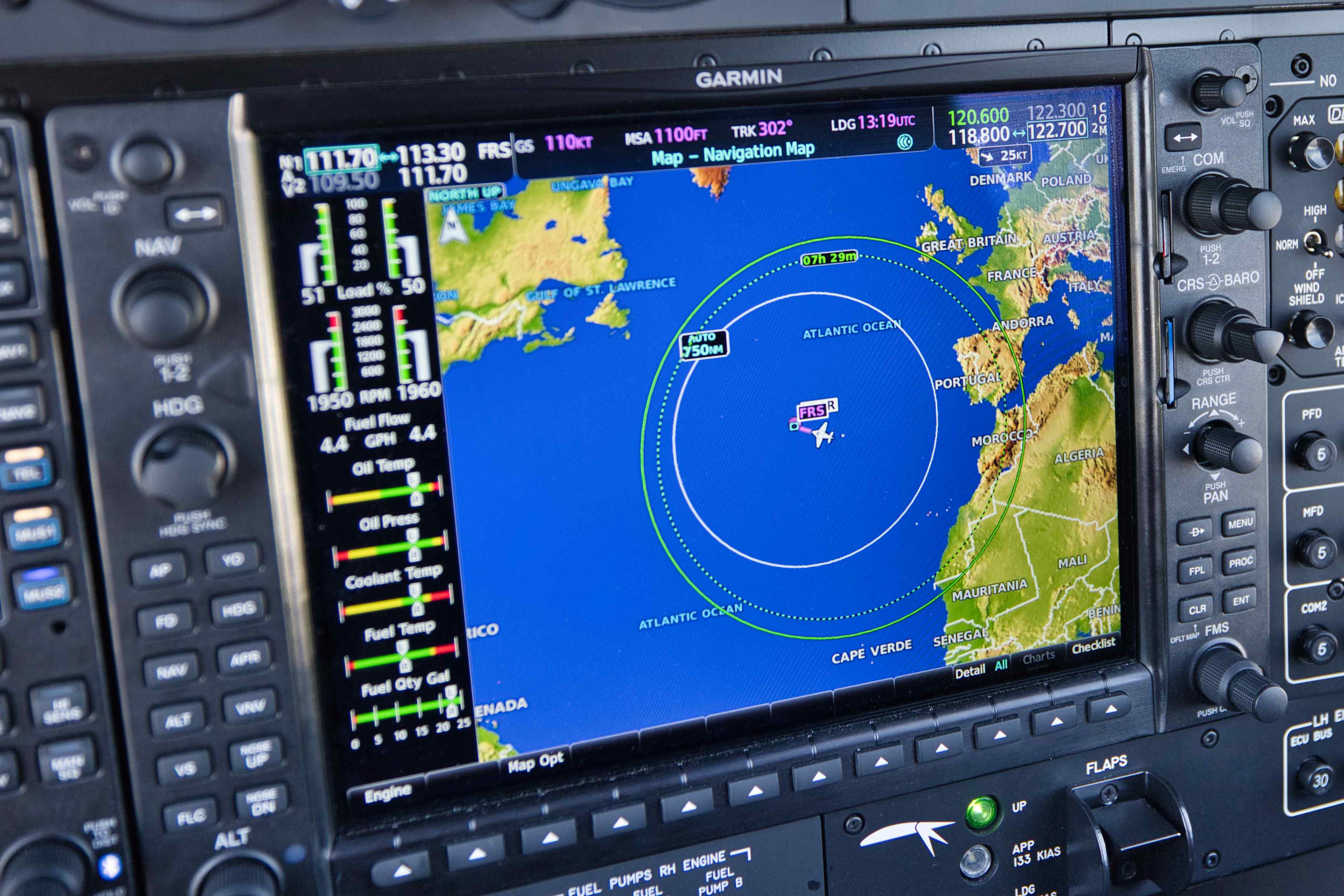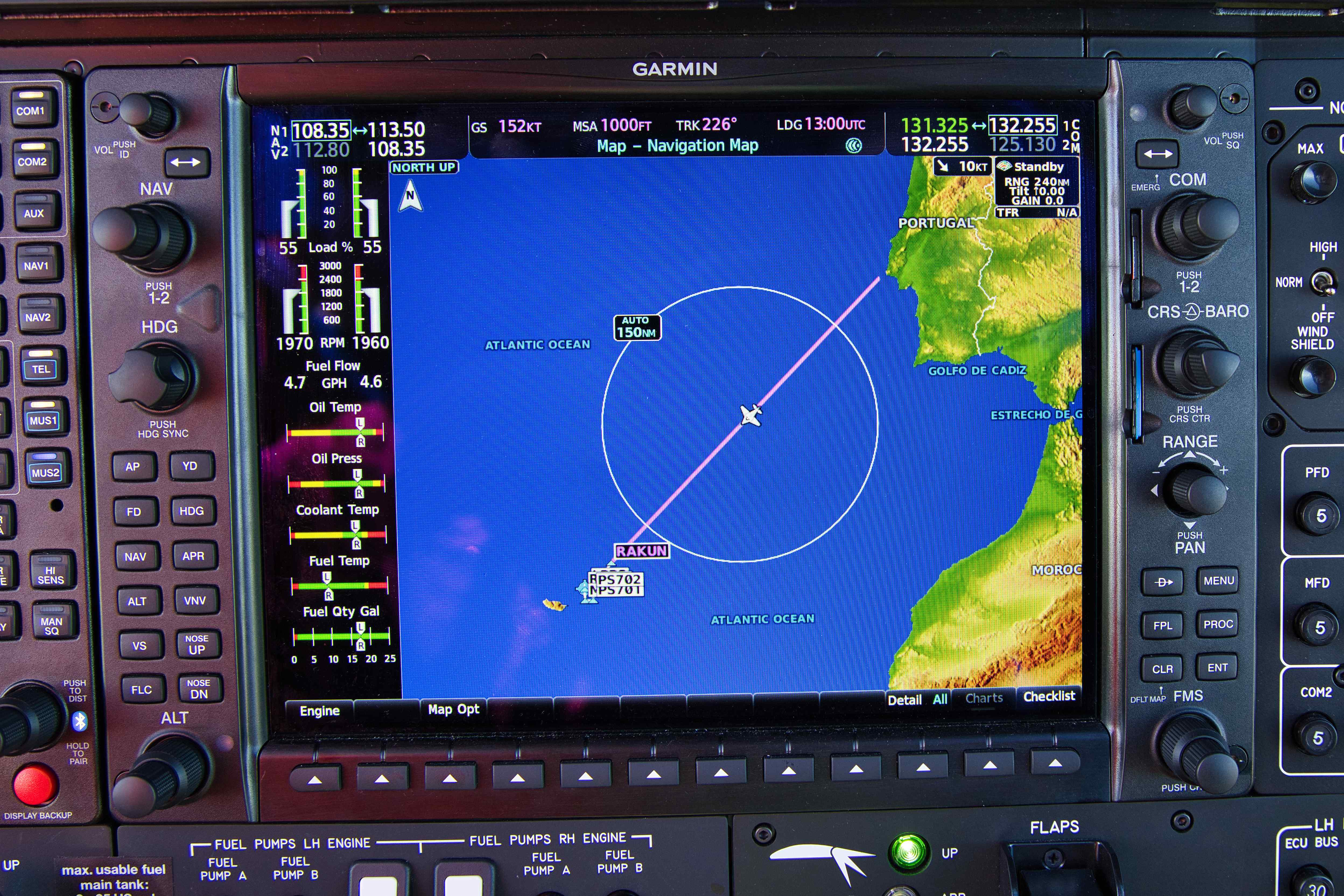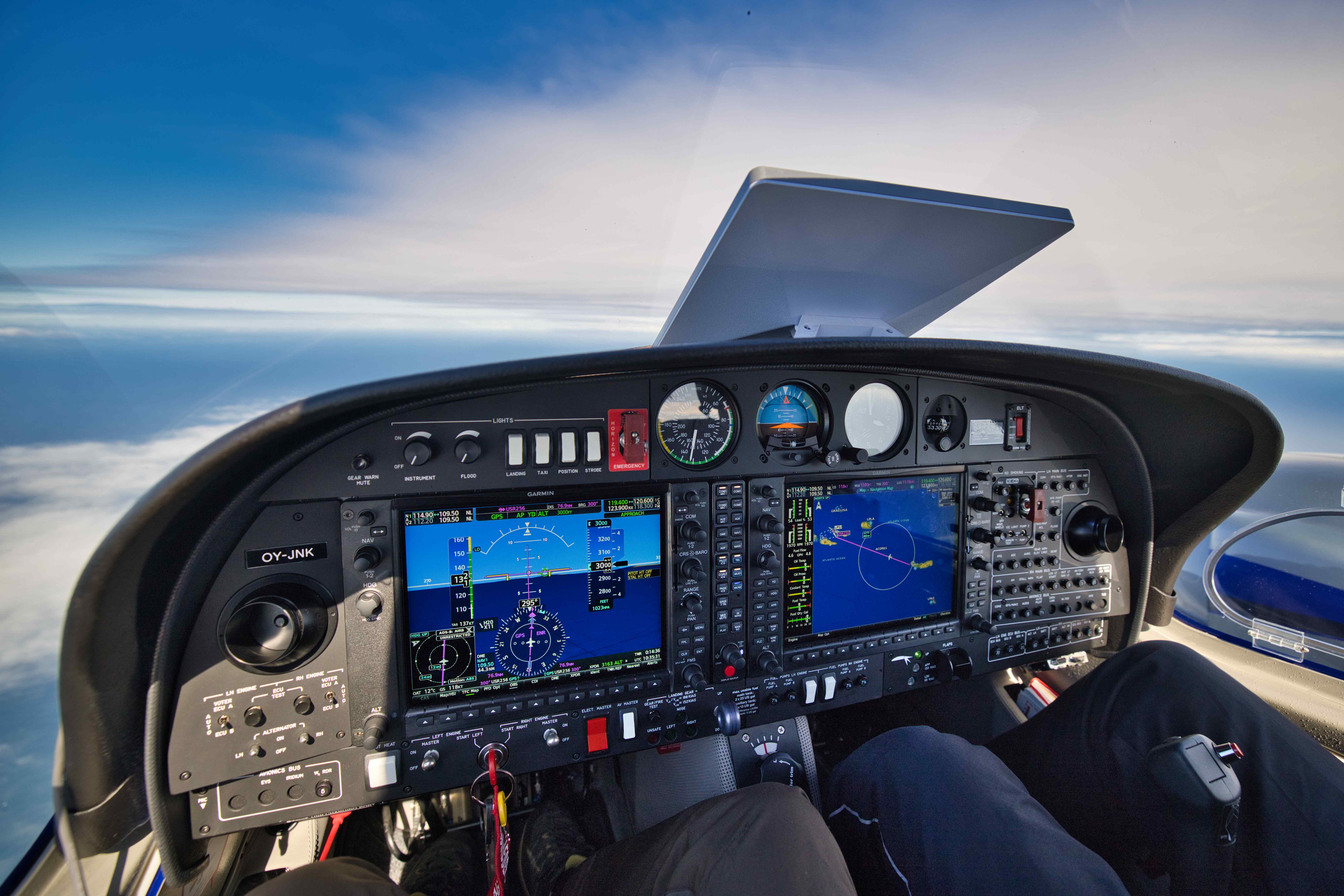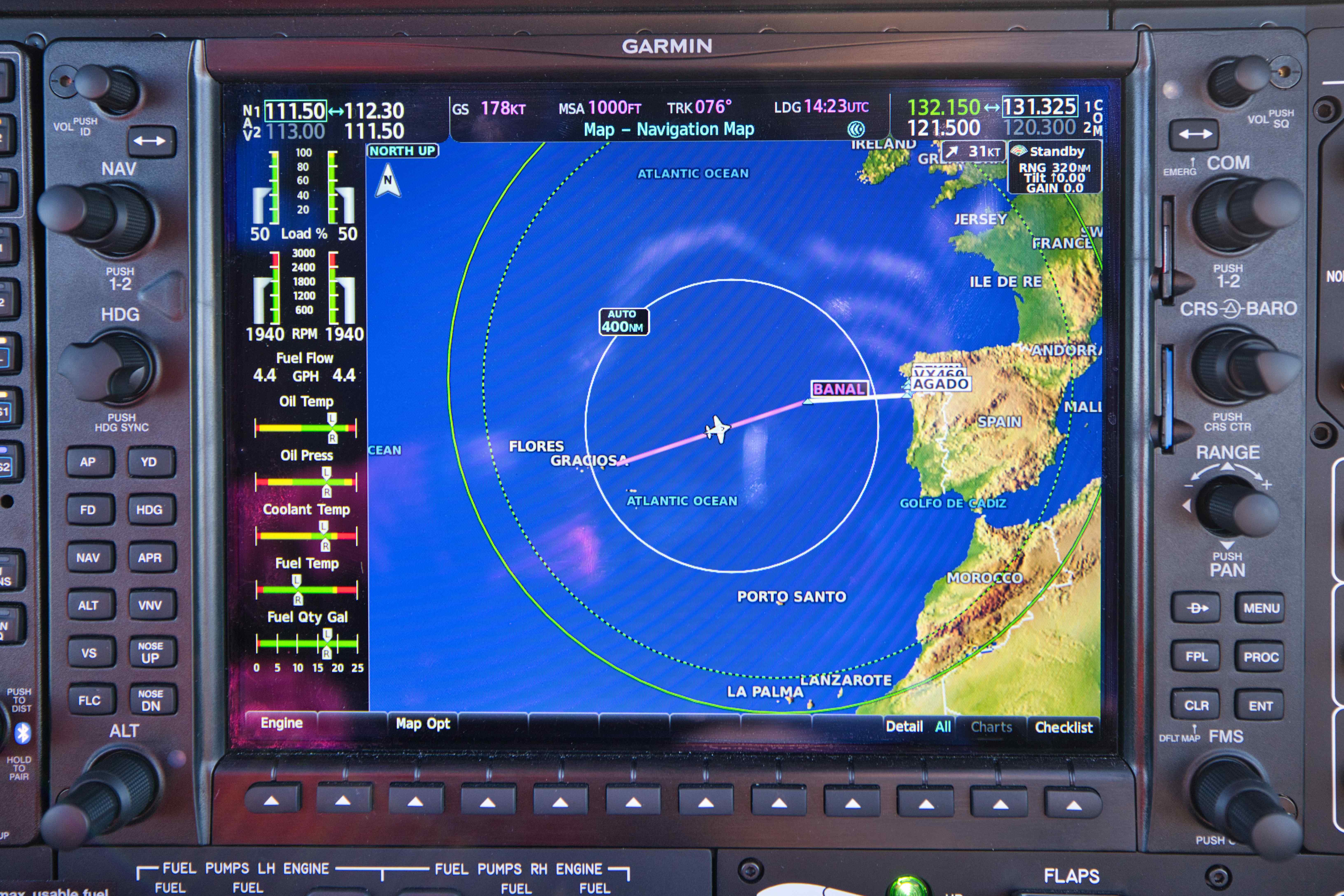 We flew home to Denmark in just two days. On April 23rd the winds was perfect for a long jump from Lajes (LPLA) to Vigo on the western coast of Spain just north of Portugal (LEVX). We flew at FL180 (18,000 feet), we had tail winds all the way between 25 and 45 knots, exactly as predicted, we flew 850 nautical miles (1,550 km) over the Atlantic Ocean. And when landing after more than 5 hours of flying, we still had 29 out of 76 gallons left (3 hours of flight time). My pre-flight planning predicted 30 gallons left at touchdown!